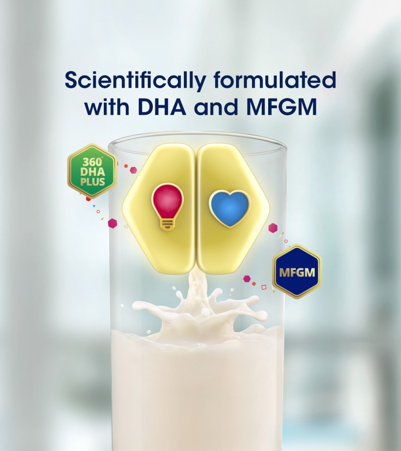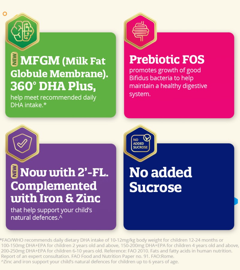 • Milk Fat Globule Membrane (MFGM) is a natural source of phospholipids and spingomyelin, derived from whey protein Formulated with 360’ DHA Plus to help meet recommended daily DHA intake*.